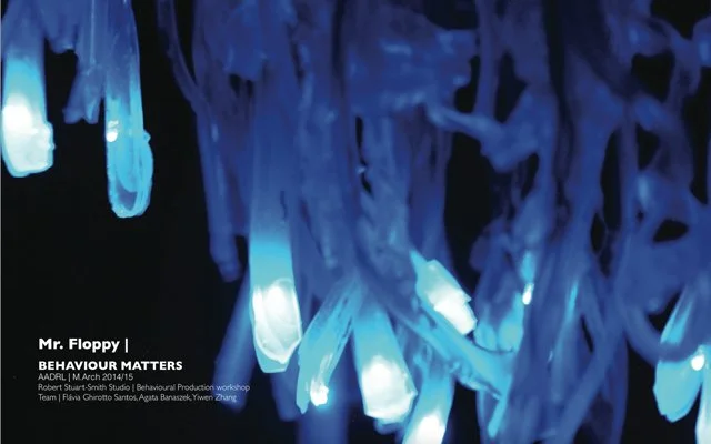 The aim of this project was to design a lighting installation able to transform over time through the use of passive and active actuation. In order to provide unique movement and lighting effects we analyzed material behavior through the organization of matter and energy within supple membranes. We developed fabrication strategies that harness energy transfer for generative design by utilizing principles such as pre-tensioned surfaces. Our focus was to analyze thermodynamic states of rich poly-scalar materials, in particular silicone. As a result, we created a single-object installation, which can be duplicated in order to organize space. The natural behavioral characteristic of silicone was utilized to produce a surface which was stretched and held in a permanent and pre-tensioned state by an integrated primary frame.